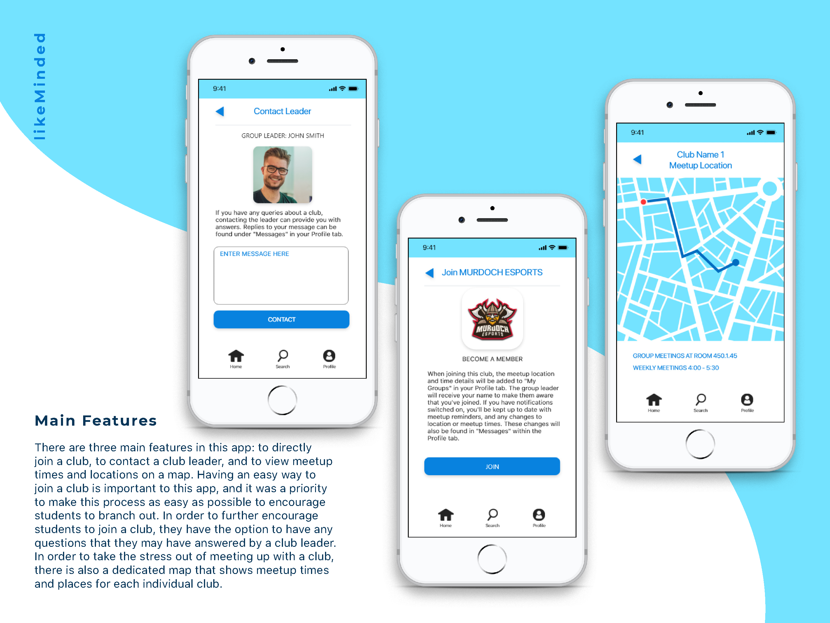 This app concept that I created, likeMinded., was in response to the lack of students that were involved with Murdoch University’s many clubs. This app would allow students to find clubs that aligned with their interests and find all the necessary information that they could want to know about a specific club.