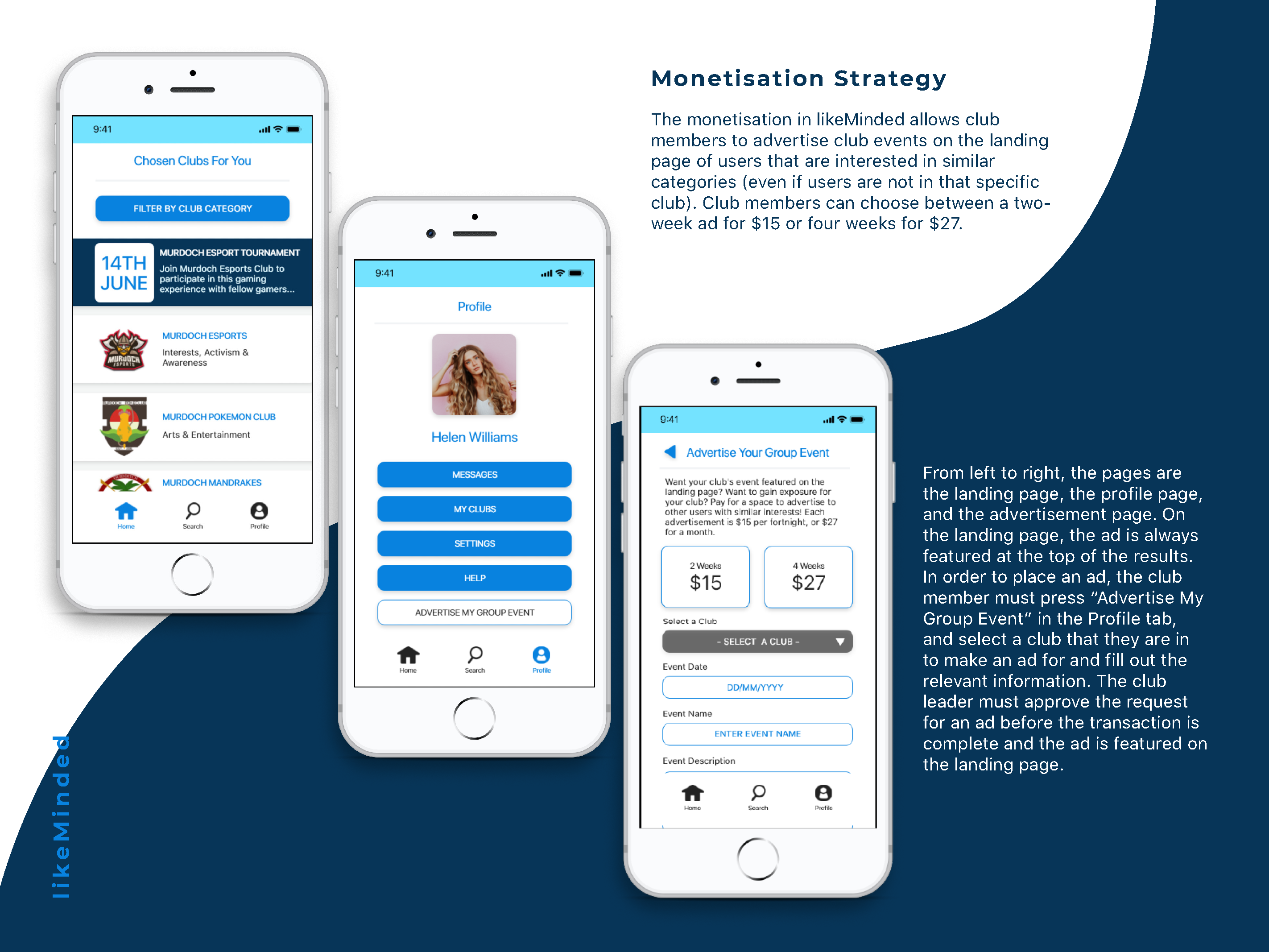 One of the most important aspects of app design is onboarding. It eases the user into beginning to use your app. For likeMinded., I went with the top-user-benefits model. This informs the user on what the app can offer them. The person using likeMinded. will learn straight away that Murdoch has a large range of clubs, they can tailor the app to match their interests, and they can always find meet-up locations on a map. The three main features of likeMinded. are: to directly join a club, to get in contact with the leader of a club, and to view meetup times and locations on a map. Making these options streamlined for the user will raise their confidence and encourage them to branch out and join groups. The potential stress of someone that isn’t very social might face is minimised because they can hide behind a screen before committing to a face-to-face meeting with a club. To keep this app running on various app stores, I added a monetisation strategy. Club members can pay to advertise their club events on the landing page of users. People that want to place an ad can make a two-week ad for $15 or a four-week ad for $27. To access this feature, the user will have an “advertise my group event” button at the bottom of their profile.