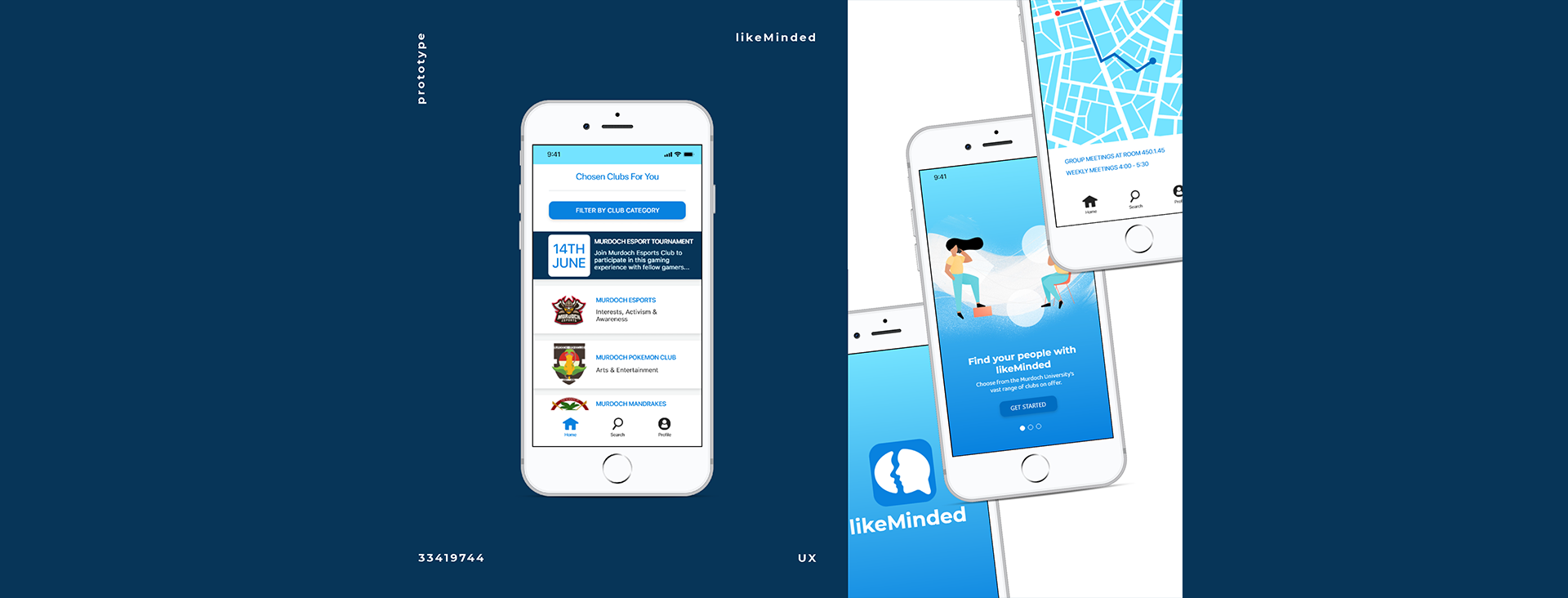 The focus of this project was to learn about the importance of user experience design and how it can affect the process of creating a project. At the time of creating this prototype for likeMinded, Murdoch had 142 different clubs. These clubs fell into categories such as: “Arts and Entertainment”, “Education and Training”, “Environment, Energy, and Wildlife”, “Ethnic and Multicultural”, “Interests, Activism, and Awareness”, “Political”, “Religious and Spiritual”, “Sport and Recreation”, and “Veterinary”. We also focused on how developers keep apps running on Android and Apple stores and implemented monetisation strategies that would allow the app to keep running. In order to keep a person using our app, there was also the added element of push notifications to draw someone back into the app.